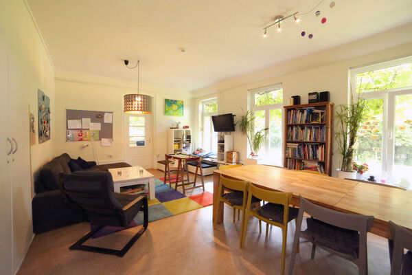 Neben den Wohnräumen verfügt die Einrichtung über eine Vielzahl weiterer Räume, die die pädagogische und kreative Arbeit unterstützen: ein Kinderwerkraum, ein Töpferkeller, ein Musikzimmer, ein Bewegungsraum sowie flexibel nutzbare Multifunktionsräume stehen ebenso zur Verfügung wie ein Nachtbereitschaftszimmer und eigene Sanitärbereiche für Mitarbeitende. Die Verwaltung des Hauses ist über eigene Büros angebunden. Hinzu kommen eine Werkstatt, eine zentrale Küche mit Vorratsräumen, eine Waschküche sowie ausreichend Stauraum im Keller- und Speicherbereich.